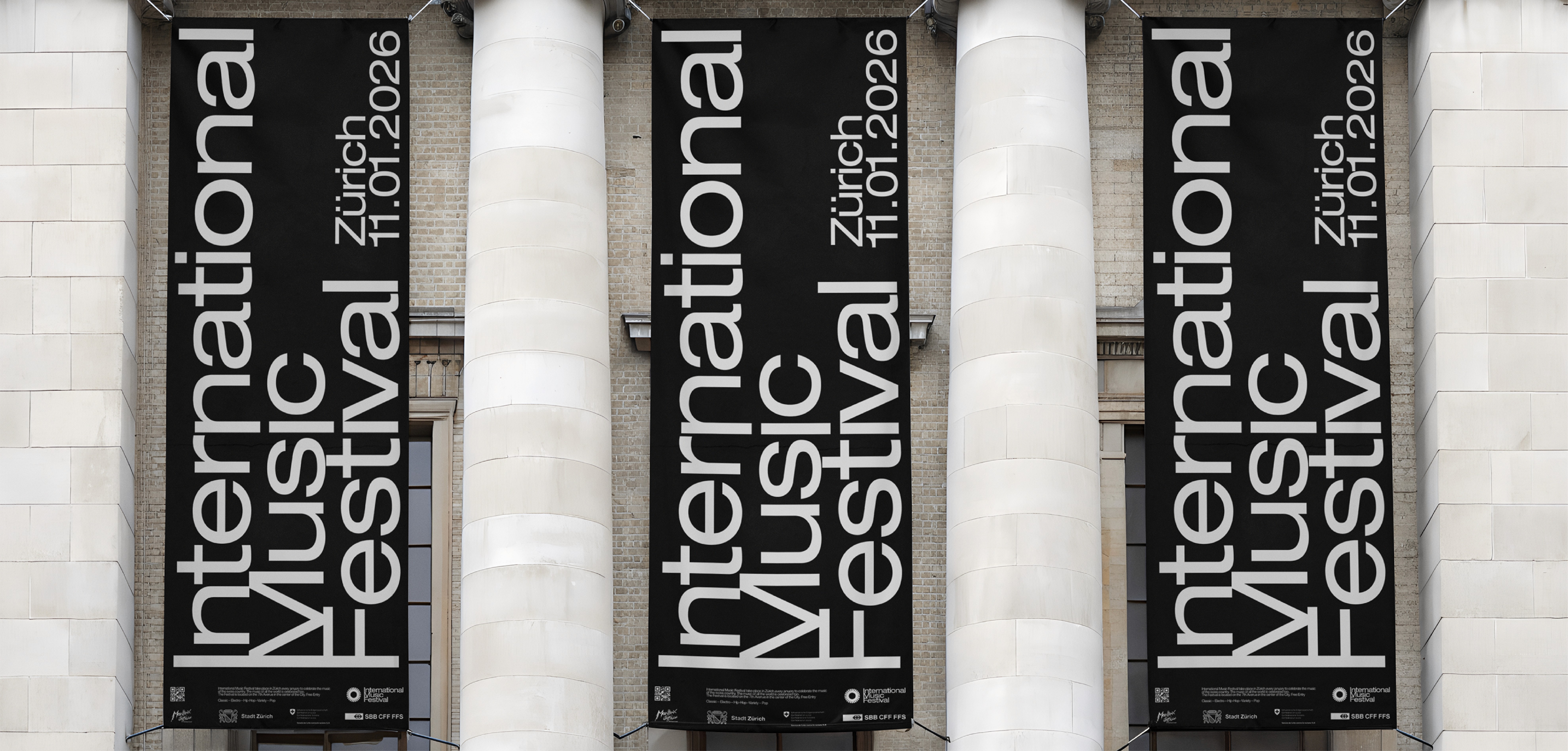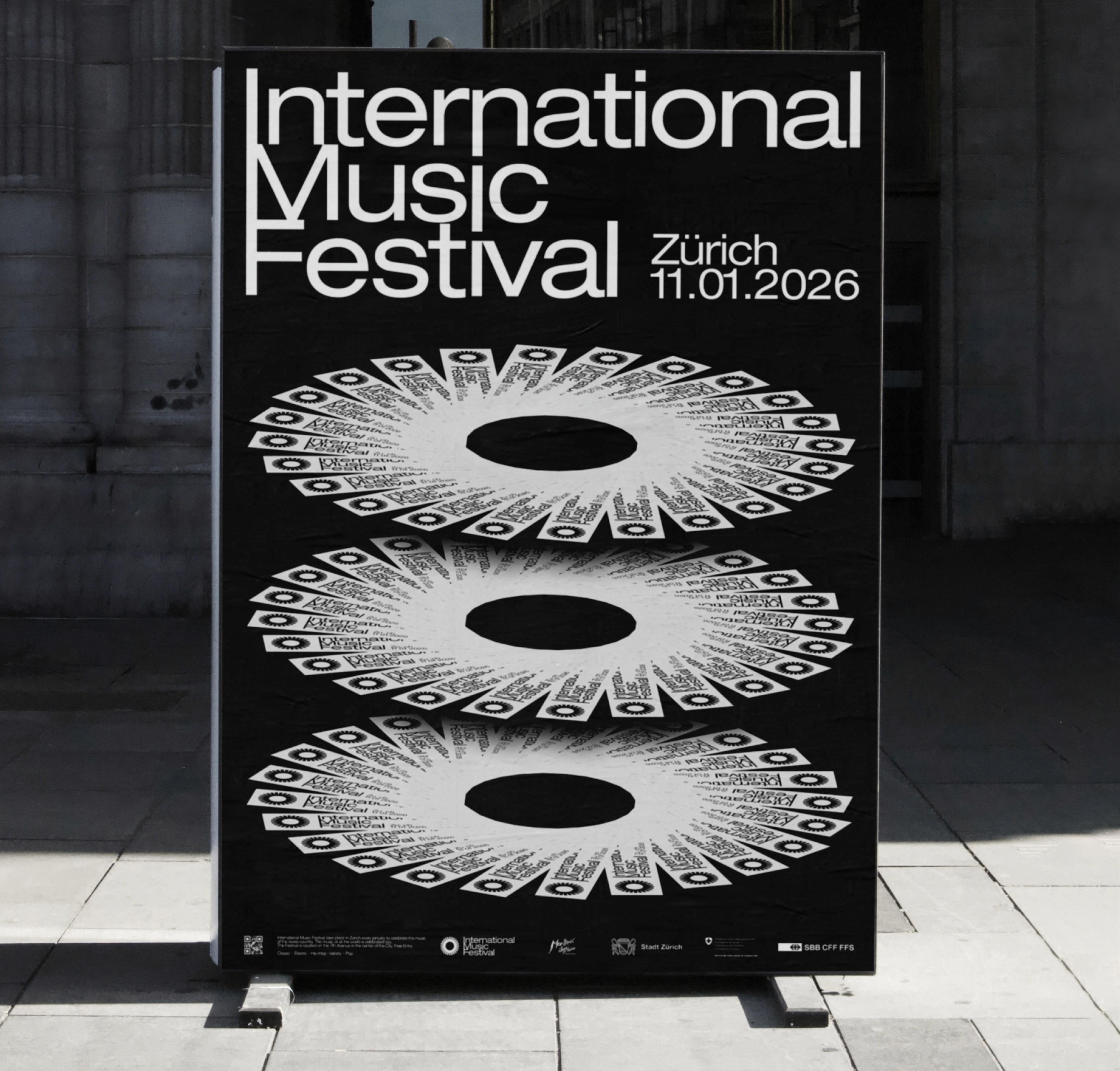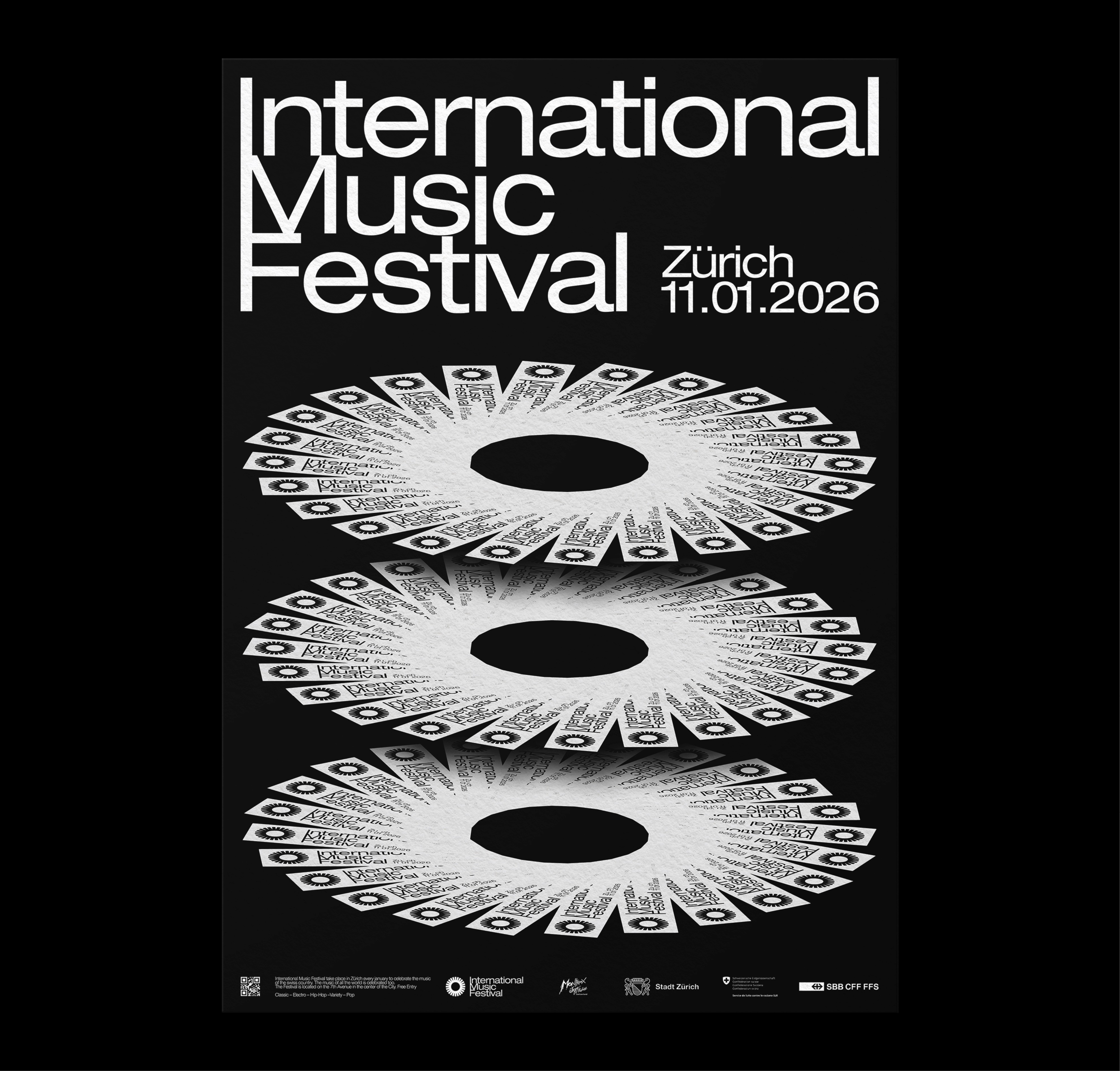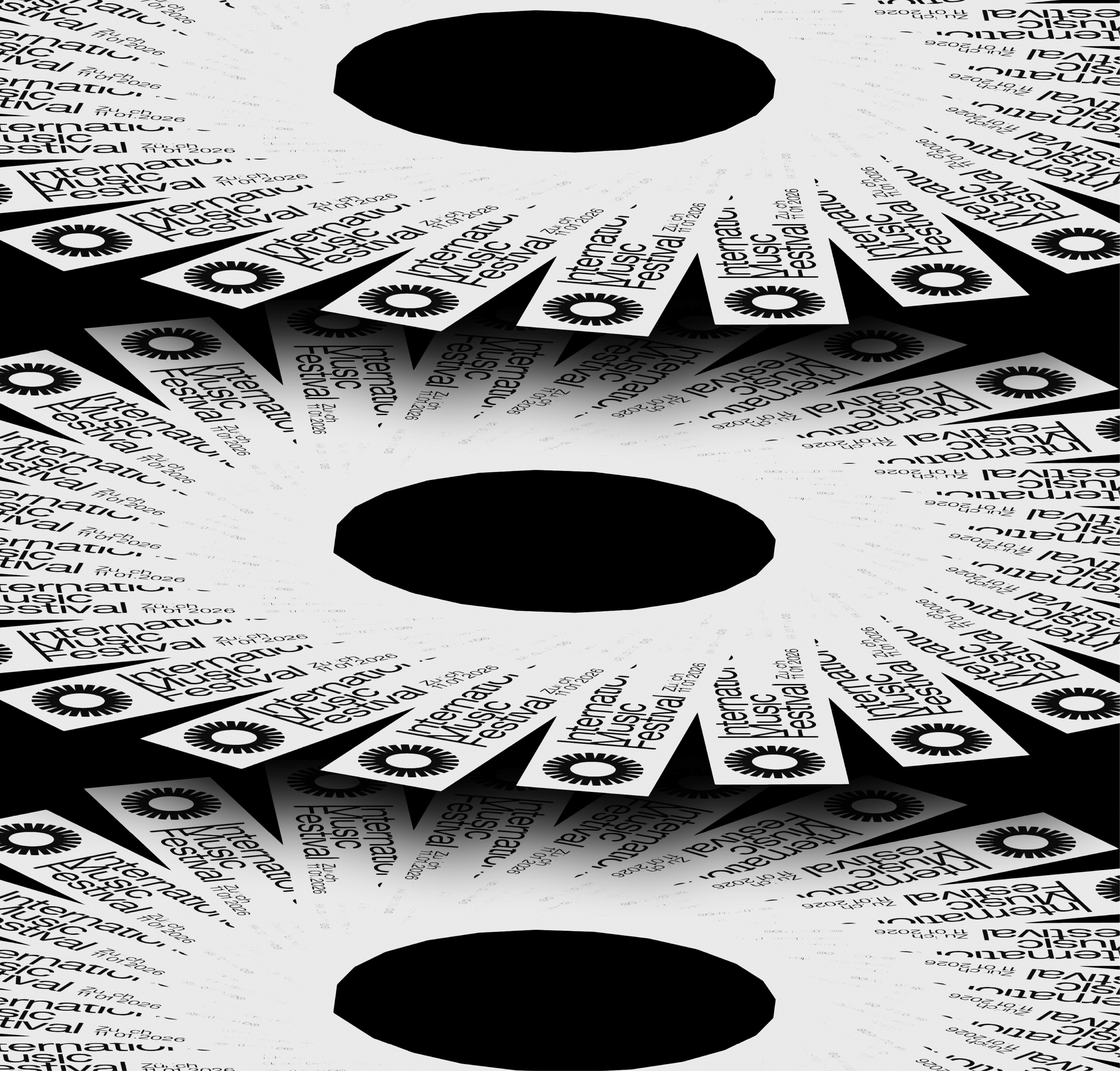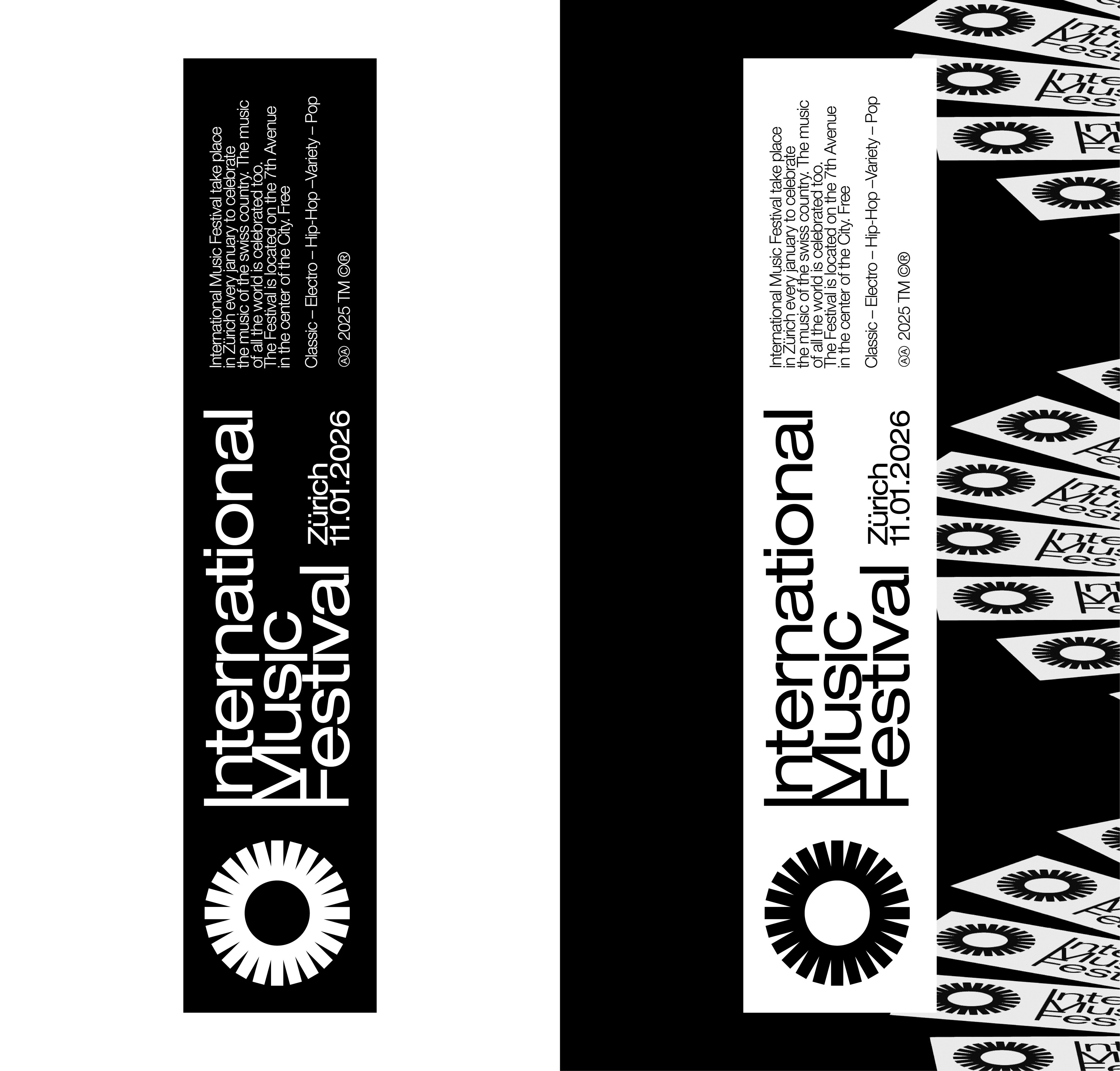Identité visuelle pour un événement fictif, le Festival international de musique, se déroulant à Zurich.