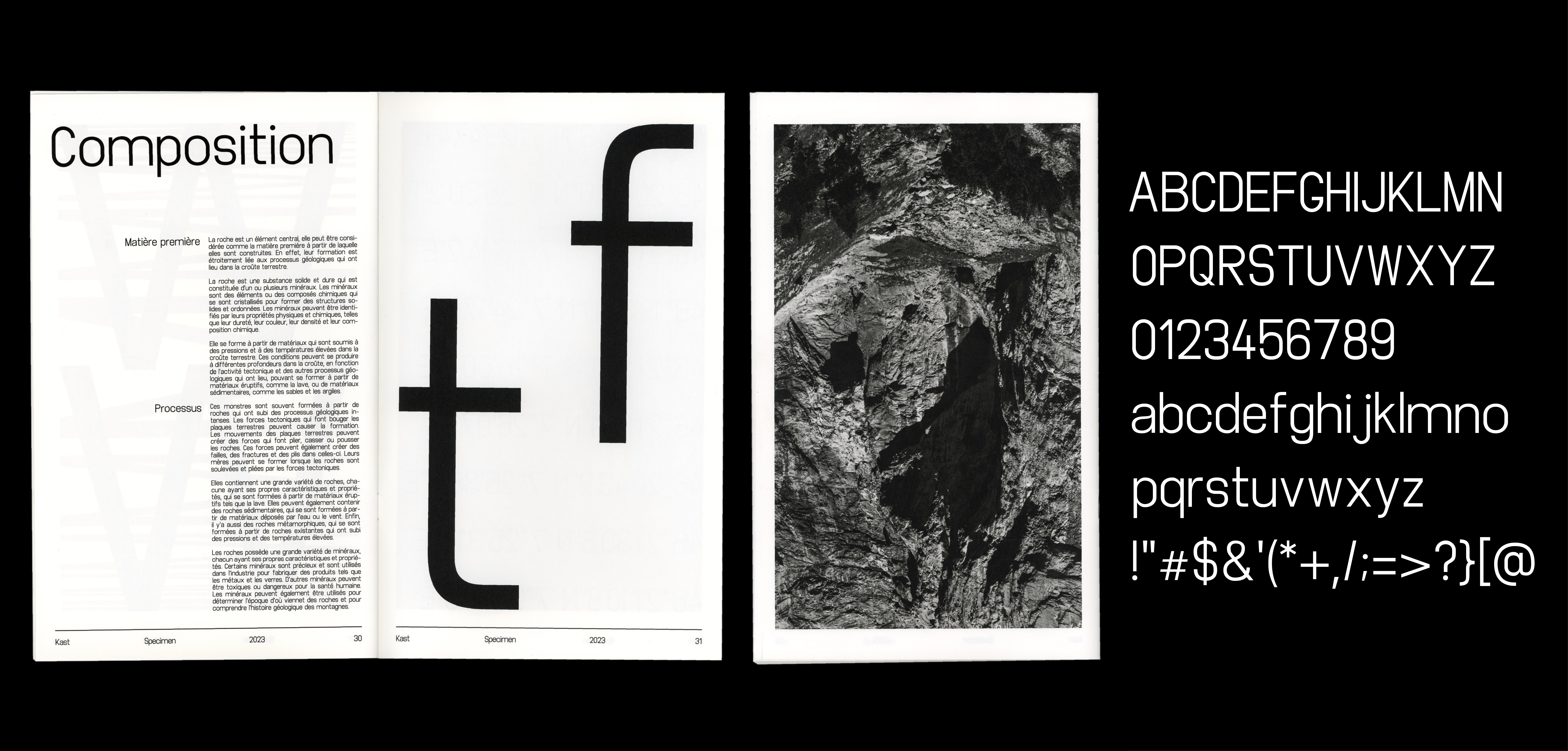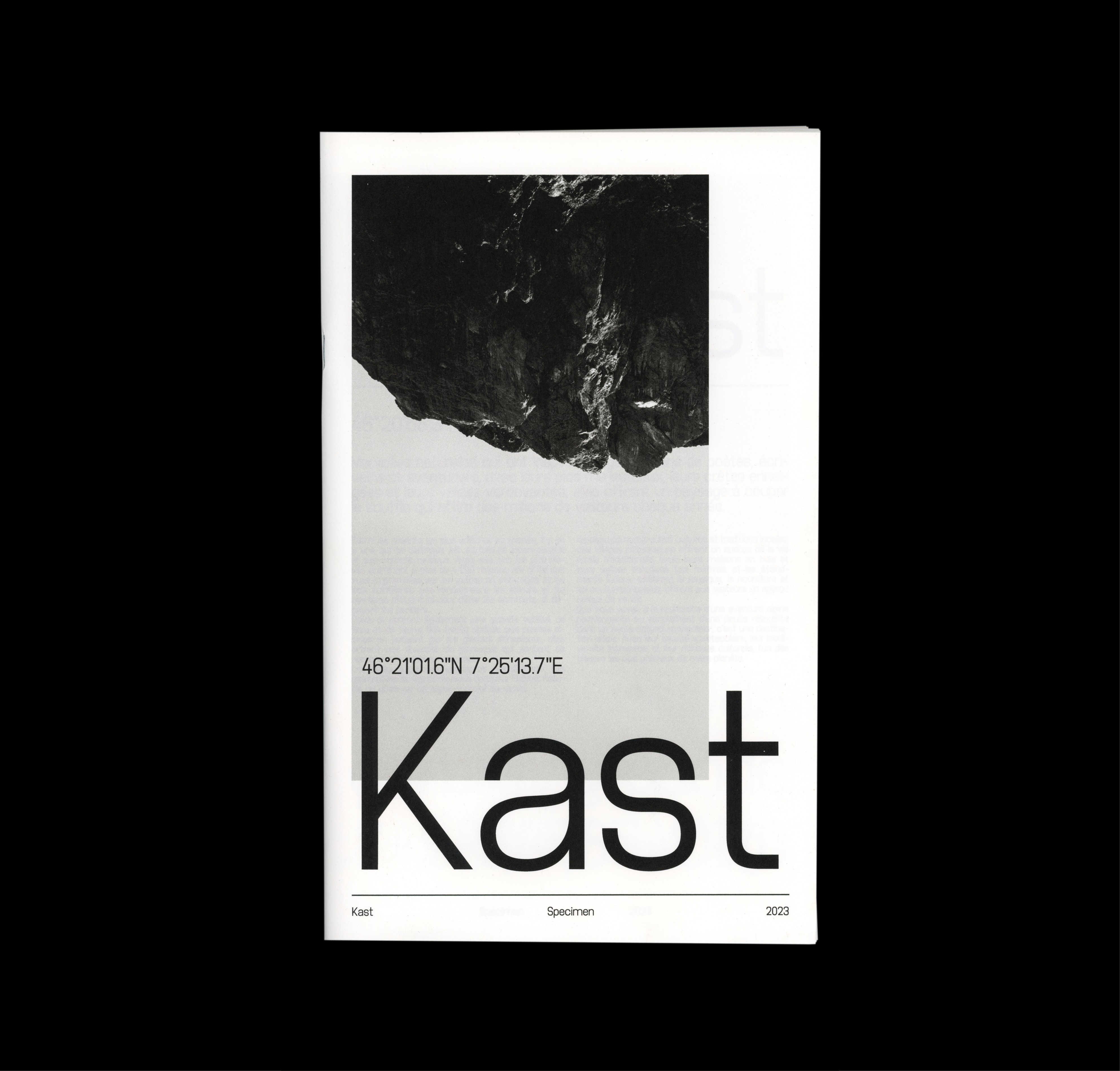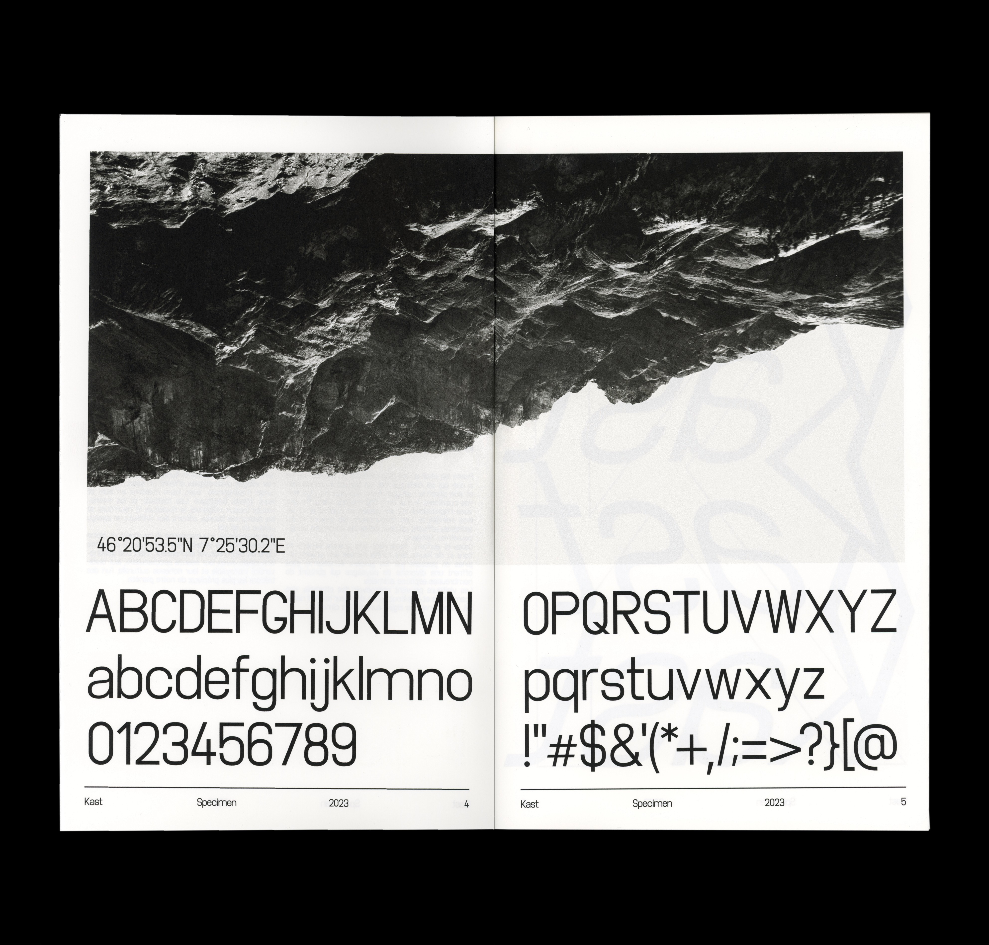 Création d'une police de caractères, inspirée du style suisse, destinée aux textes professionnels. Le spécimen est agencé autour du thème de la montagne, une référence évidente à ce pays.